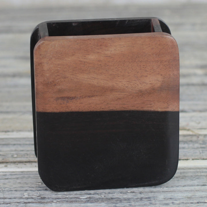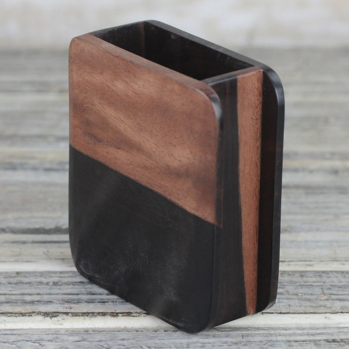 Artisan Robert Lanyo of Ghana hand carves a modern, clean-lined pencil holder out of ebony wood. The simple curved rectangular design showcases the beauty of the varying colors of ebony wood.
