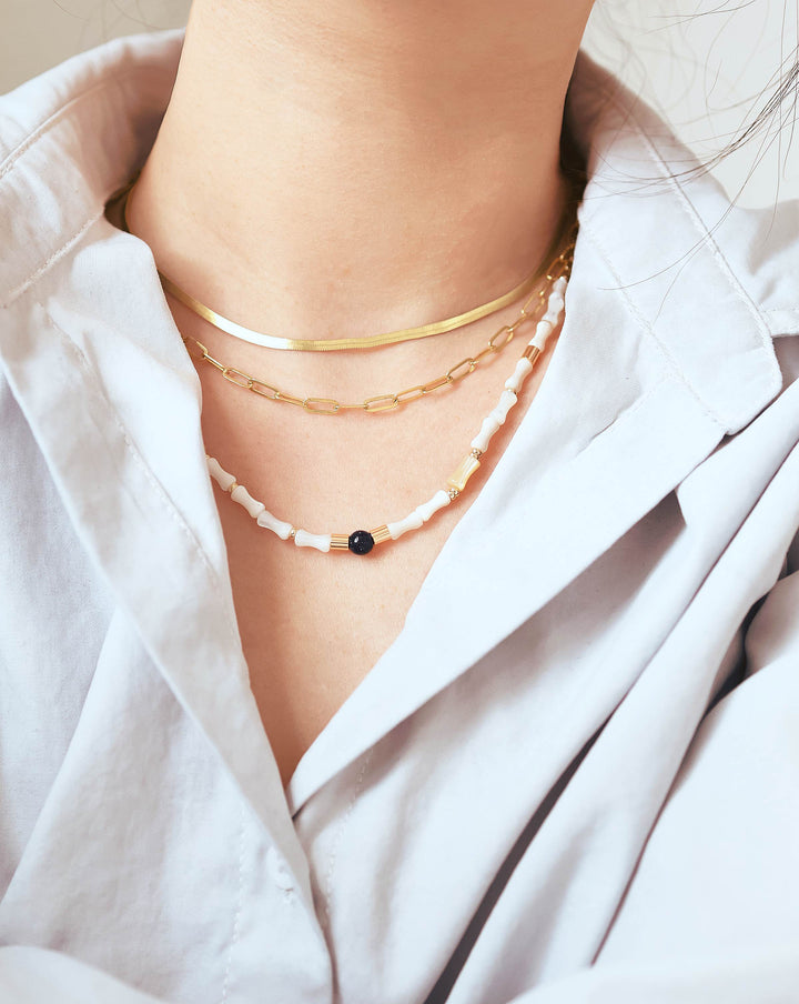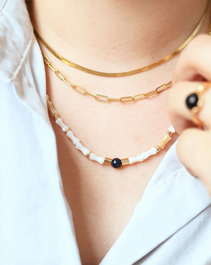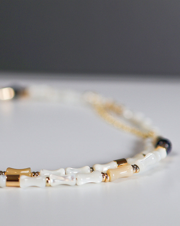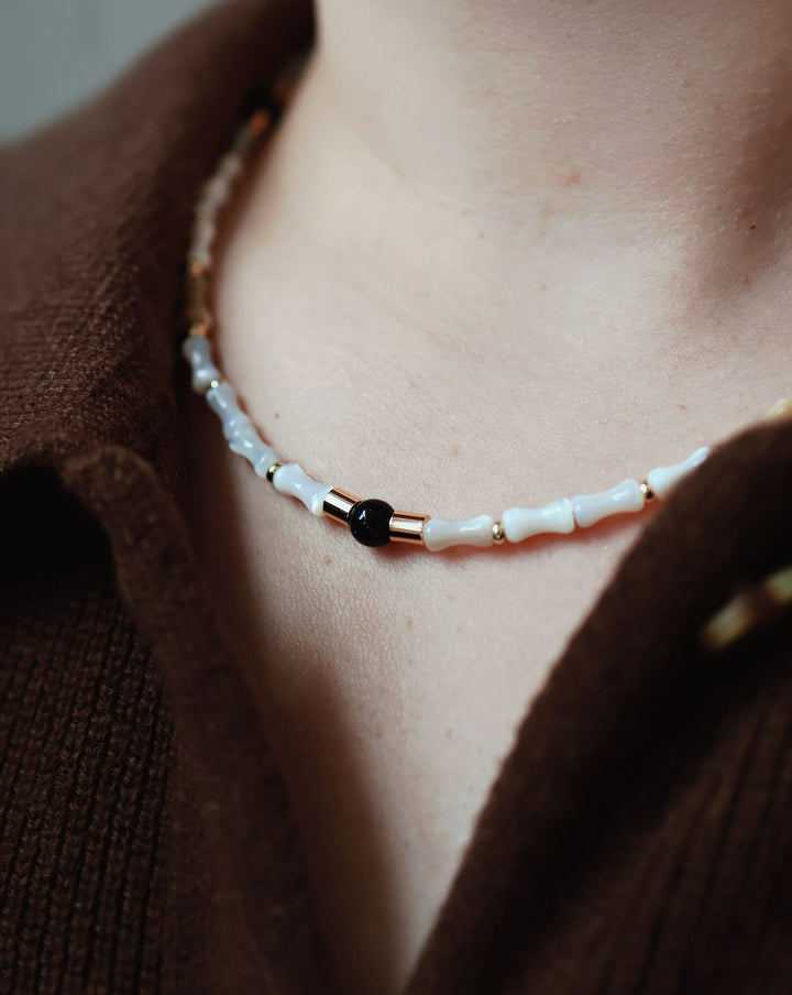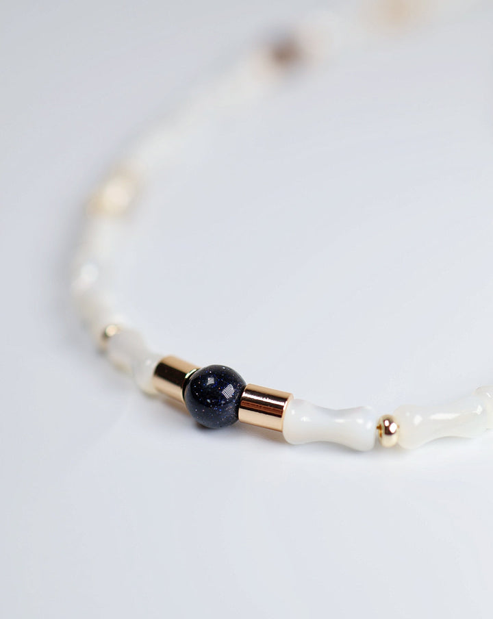 Crafted from natural mother-of-pearl, shaped into bamboo-inspired nodes, and embellished with deep blue sandstone, this necklace exudes elegance with a touch of mystery. Crafted by hand, each bead shines with its own unique pearl luster. Wear solo or stack with others for a beautiful layered look.