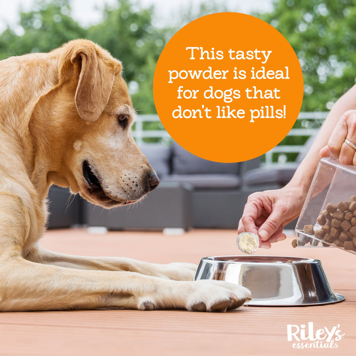 Riley's Multi-Essentials powder for dogs features a full range of essential daily vitamins, organically chelated minerals, antioxidants, along with spirulina, kelp and milk thistle for the additional nutritional support that dogs need. Our pleasant tasting, soya-based powder with no added refined sugars or artificial flavors is easily administered with either wet or dry food. Ideal supplement for home-prepared meals and recommended even for dogs who are on complete and balanced pet food diets.