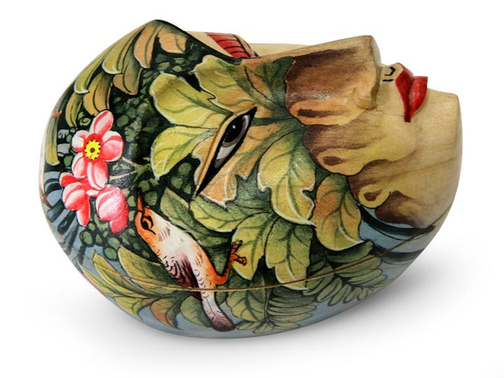Emerging amid fertile foliage and flowers, a mysterious woman is carved from crocodile wood. Gusti Ngurah Semarajaya handcrafts a petit jewelry box, painted by hand and lined in velvet.