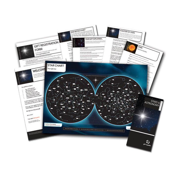 - Includes: Welcome letter, Your gift explained, A history of stars fact sheet, Star details, Stars & astronomy leaflet, Star facts & figures poster, Star poster, and, Registration sheet