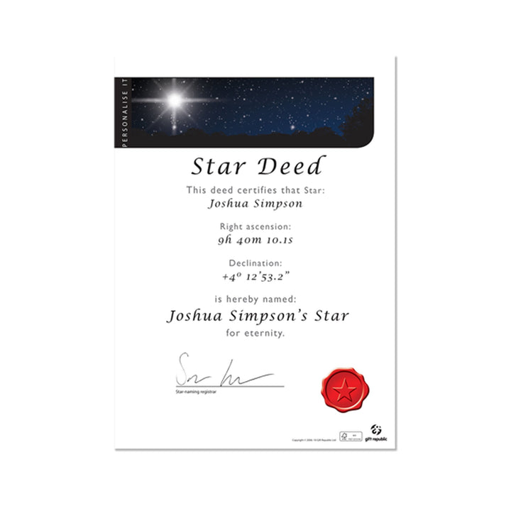Disclaimer: This gift does not grant legal ownership or title to a star. It is the enduring and personal sentiment behind this gift that is significant. Neither Gift Republic nor any other supplier can alter the name of well-known stars. The chosen star name will not necessarily be recognized by any scientific organization or by astronomers and Gift Republic can accept no liability for this. Star names are published in the Gift Republic Star Catalogue which is stored in a secure location. A record of the Registry is periodically submitted to the British Library to ensure public accessibility and preservation. This is a novelty gift item and must be regarded as such.