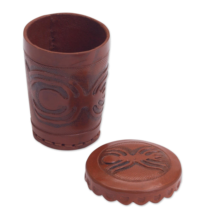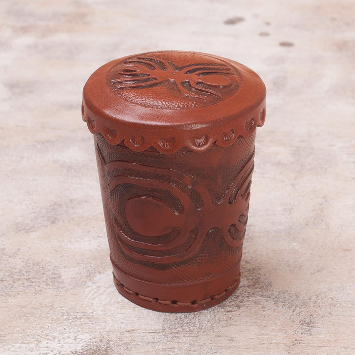 This stately dice cup and lid is beautifully crafted by Peru's Abel Rios from richly tooled leather. Embossed on the cup and lid is the spider from the famous geoglyphs of the Nazca plains. The game set includes five dice.