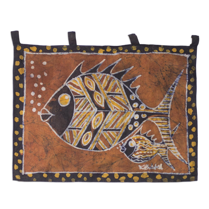 The story of this artwork has great meaning and depth. K. Baka uses a beautiful blend of yellow, red, and black to portray the wonder of a woman's protectiveness and love and her endowment of resilience. Entitled Nye Ke Bi (the Fish and the Fry). The fish has natural gifts to handle intense stress and evade danger.