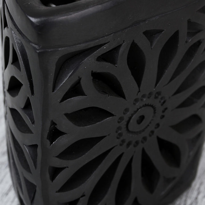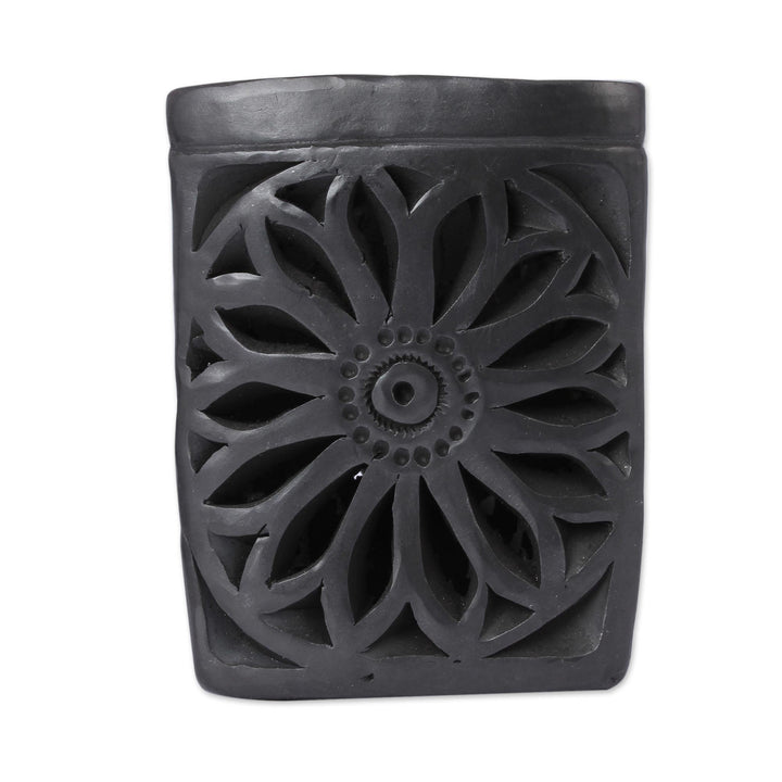 This triangular barro negro pencil holder is handcrafted by artisan Anakarem of Oaxaca, who works as a team with his father. Barro negro, literally translated as 'black mud,' is a type of pottery from clay only found in Oaxaca, Mexico, and crafted using traditional methods. The black color comes from the clay itself, enhanced during the firing process. This pencil holder has a flower on each side made through a combination of embossing and decorative cutouts.