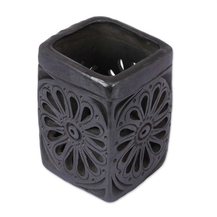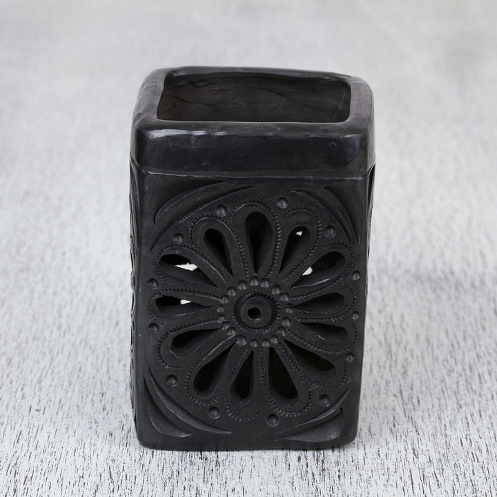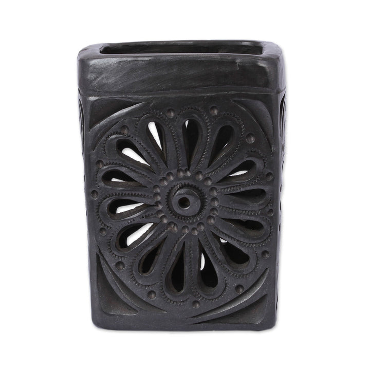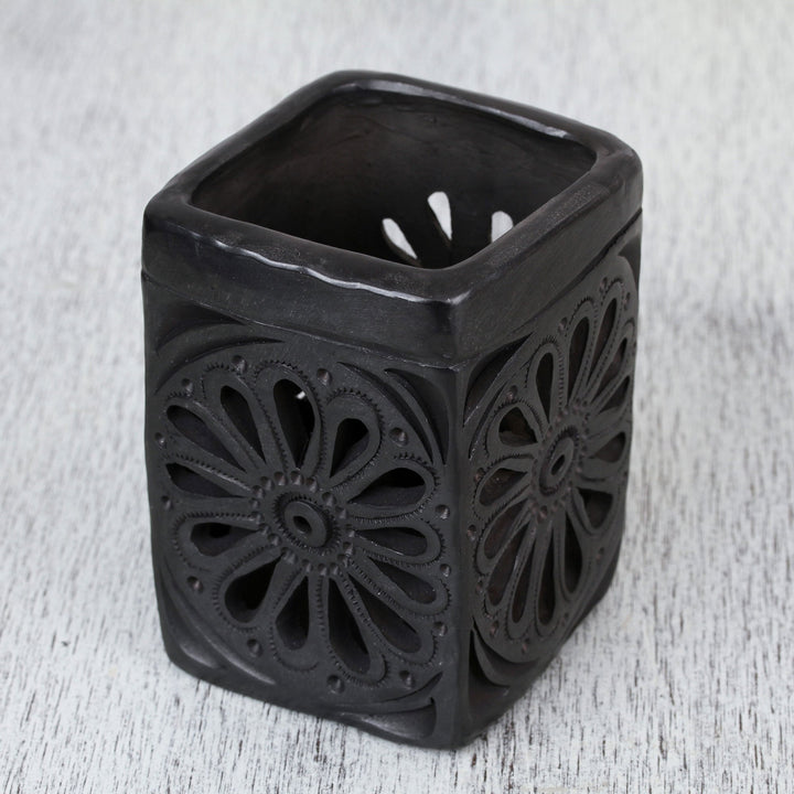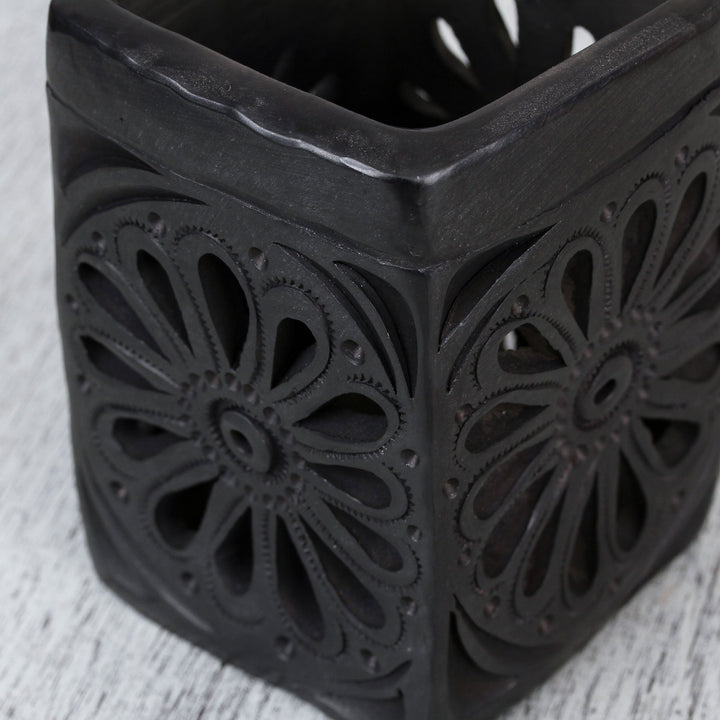 This rectangular barro negro pencil holder is handcrafted by artisan Anakarem of Oaxaca, who works as a team with his father. Barro negro, literally translated as 'black mud,' is a type of pottery from clay only found in Oaxaca, Mexico, and crafted using traditional methods. The black color comes from the clay itself, enhanced during the firing process. This pencil holder has a flower on each side made through a combination of embossing and decorative cutouts.