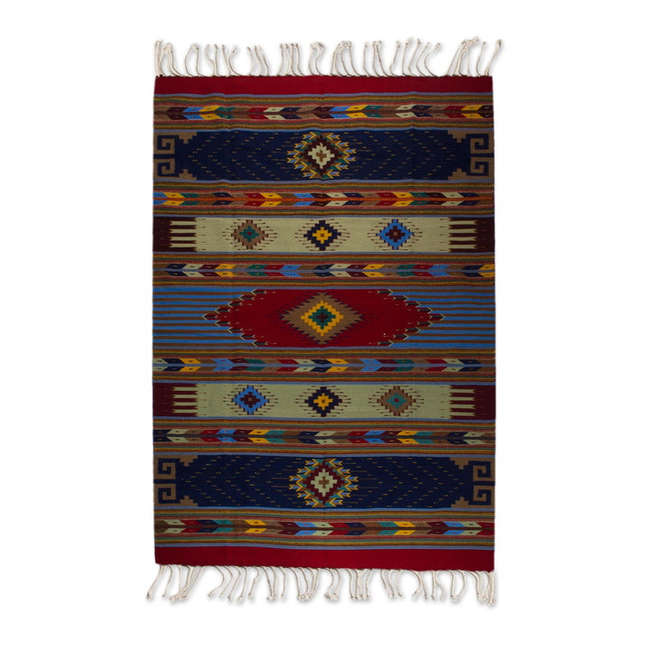 Tinted with natural colors, this impressive area rug from Mexico features multicolored geometric motifs across its rectangular woolen surface, bringing a taste of Oaxacan heritage to any home. Alfredo Ruiz designs the handwoven rug in the Zapotec style, challenging himself to create rugs with ever-increasing complexity and beauty.