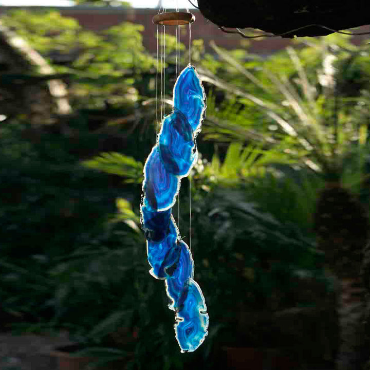 The mysteries of the oceans are revealed in the melodious chimes of this mobile from Guena. It is inspired by Feng Shui principles that tell of positive energies coming through as the wind announces its passing. The mobile is crafted by hand with dyed blue agates that reflect the oceans' deep blue core. They are suspended suspend from a pinewood hoop that hangs from a nickel-plated ring.