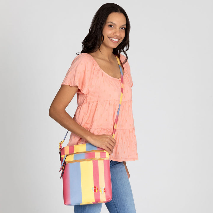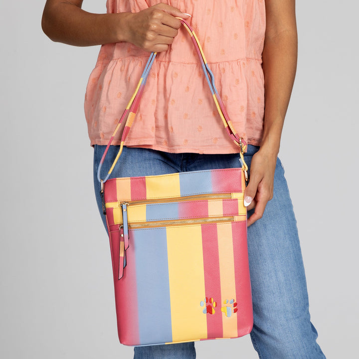 Vertical ombre stripes in sunset hues bring dramatic color to your look, while the animal-friendly faux leather speaks to your animal advocacy! Plenty of pockets and a secure main zipper closure add organization to your day, and the fully adjustable strap makes this mid-size crossbody purse perfectly built for you. Complete with embroidered pair of paws on the front corner, proudly sharing your support of animal rescue causes!