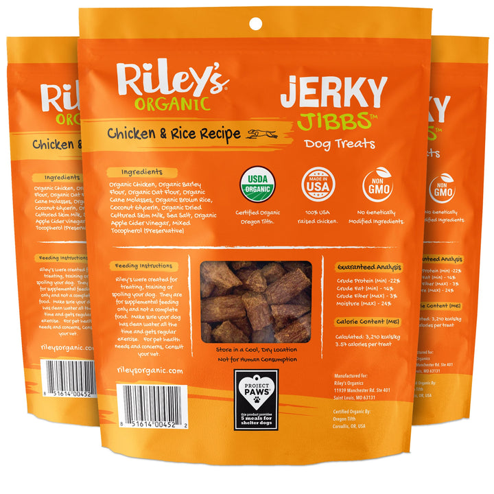 Riley's Organic Chicken & Rice Jerky Jibbs Three Packs are the perfect way to return the love your dog gives you every day. Certified Organic, Jibbs are low in calories and perfect for training. Dogs of all sizes give these delicious treats a four-paws vote of approval. When you want to give your best friend the very best, make it Riley's.