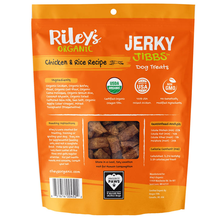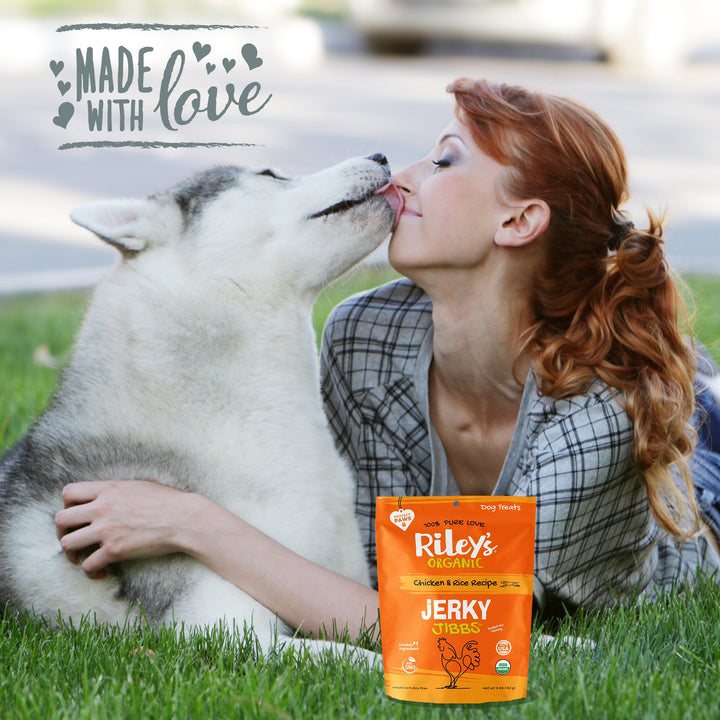 Riley's Organic Chicken & Rice Jerky Jibbs are the perfect way to return the love your dog gives you every day. Certified Organic, Jibbs are low in calories and perfect for training. These delicious treats are given a four-paws vote of approval by dogs of all sizes. When you want to give your best friend the very best, make it Riley's.