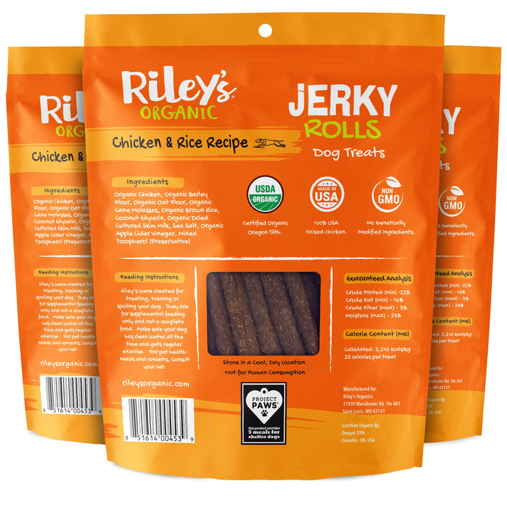 Riley’s Organic Chicken & Rice Jerky Rolls Three Packs are made from only certified organic ingredients. These healthy dog treats are tender and chewy. They are packed with whole USA-raised chicken, and the recipe was specifically made to offer dogs something that both tastes good and is good for them. When you want to give your best friend the very best, make it Riley’s.