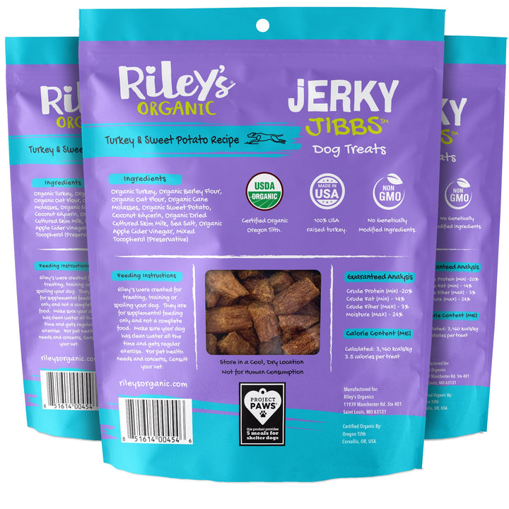 Riley's Organic Turkey & Sweet Potato Jerky Jibbs Three Packs are the perfect way to reward your dog. Jibbs are certified organic, low in calories and perfect for training. These delicious treats are given a four-paws vote of approval by dogs of all sizes.