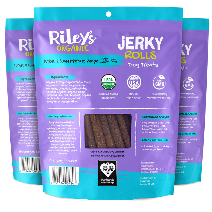 When you want to give your best friend the very best, make it Riley’s. Riley’s Organic Turkey & Sweet Potato Jerky Rolls Three Packs are a delicious way to show your dog how much you love them. Made from only certified organic ingredients, these healthy dog treats are tender and chewy. They're packed with whole USA-raised turkey, and the recipe was specifically made to offer dogs something that both tastes good and is good for them.