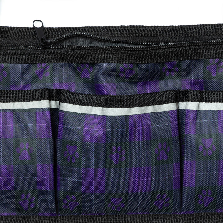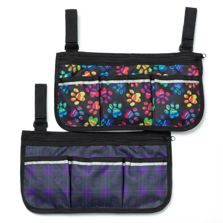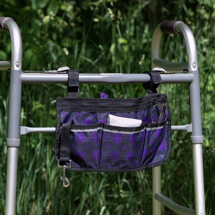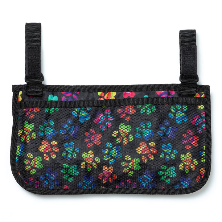 A practical and adorable accessory designed for pet lovers on the go. Featuring a compact design with multiple exterior pockets and a zippered closure, this bag attaches with adjustable velcro straps to a stroller or walker with ease -- making your life a little simpler! The defining feature is the exclusive paw print design, adding a charming touch that celebrates the bond between humans and their pets.
