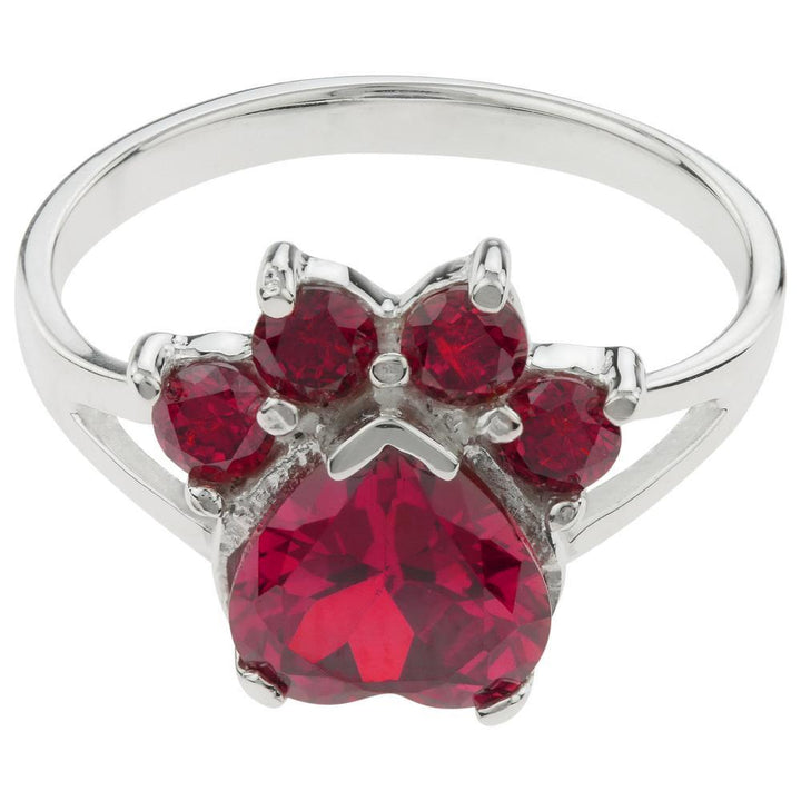 Celebrate the birth month of your beloved with a sparkling paw-print ring. A dazzling faceted crystal colored in the corresponding tone of your selected month's birthstone shines out from its regal sterling setting. Pawsitively wonderful!