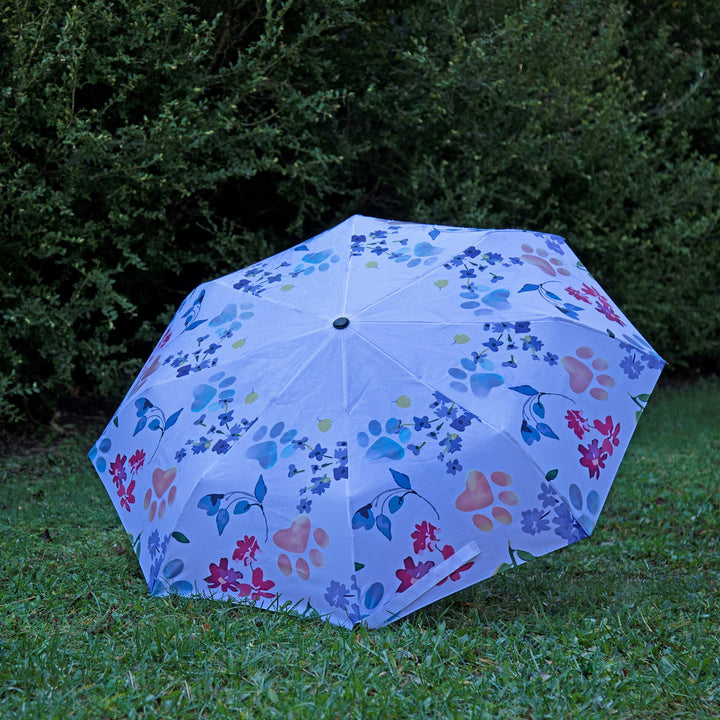 Hearts, paws, and flowers pattern each umbrella like confetti, keeping you dry when the weather has other plans! Made with an automatic open/close button and a comfortable rubberized handle, all of which fits compactly in your bag or car until needed.