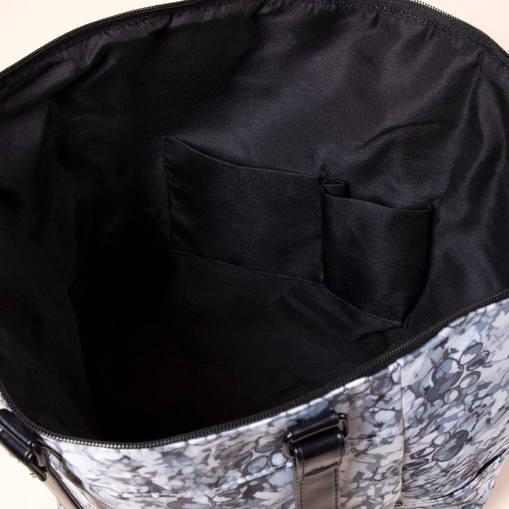 A goes-with-everything black and white tote bag patterned with subtle paw prints throughout, is the new item that you can't leave home without! Choose your favorite way to carry this sizable tote: by the two soft but sturdy faux leather handles, or the optional large shoulder strap. Topped with a secure zipper closure and two interior pockets and exterior pockets for added organization!