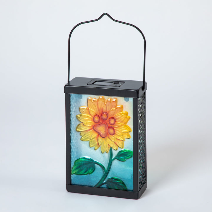 Provide a unique light-up addition to any garden or exterior space. A paw print sunflower design adds a charming decorative touch. Instantly add light, color, and character to any outdoor space with this solar-powered lamp.