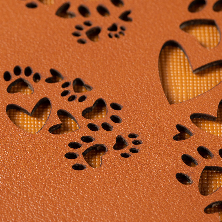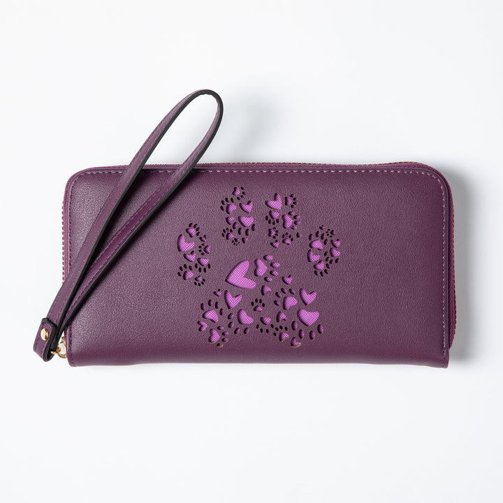 A paw print design made from tiny paws and hearts is intricately laser-cut on the front of this beautiful wristlet wallet. Gorgeously textured faux leather with plenty of pockets inside, this accessory works as a wallet or a standalone wristlet.
