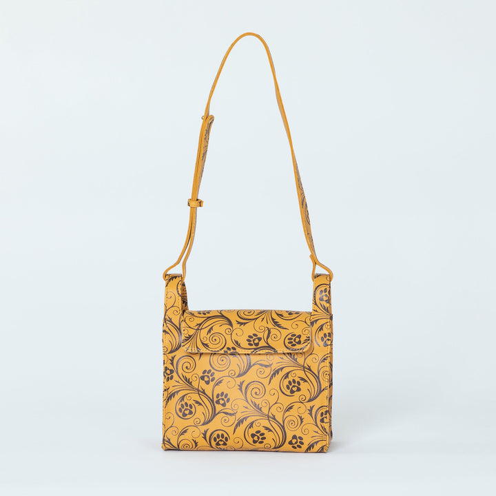 Swirls and paw prints pattern this structured and simple handbag -- your new everyday accessory! Made with a smooth, faux leather in a warm carmel color, a fixed shape so your items are easy to find, and a magnetic button closure.