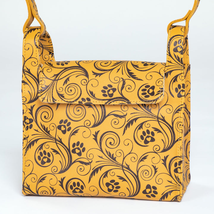 Swirls and paw prints pattern this structured and simple handbag -- your new everyday accessory! Made with a smooth, faux leather in a warm carmel color, a fixed shape so your items are easy to find, and a magnetic button closure.