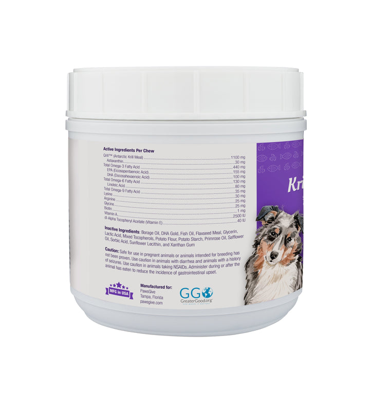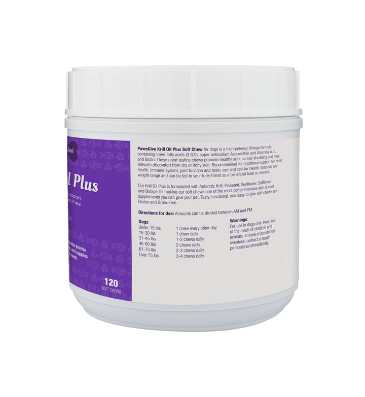PawsGive Krill Oil Plus Soft Chews for dogs is a high-potency Omega formula containing three fatty acids (3,6,9), super antioxidant Astaxanthin and Vitamins A, E, and Biotin. These great tasting chews promote healthy skin, normal shedding and may alleviate discomfort from dry or itchy skin. Recommended for additional support for heart health, immune system, joint function and brain, eye and cellular health. Ideal for any weight range and can be fed to your furry friend as a beneficial treat or reward.