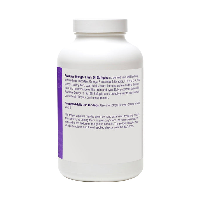 PawsGive Omega-3 Fish Oil Softgels are derived from wild Anchovy and Sardines. Important Omega-3 essential fatty acids, EPA and DHA, help support healthy skin, coat, joints, heart, immune system and the development and maintenance of the brain and eyes. Daily supplementation with PawsGive Omega-3 Fish Oil Softgels are a proactive way to help maintain overall health for your canine companion.