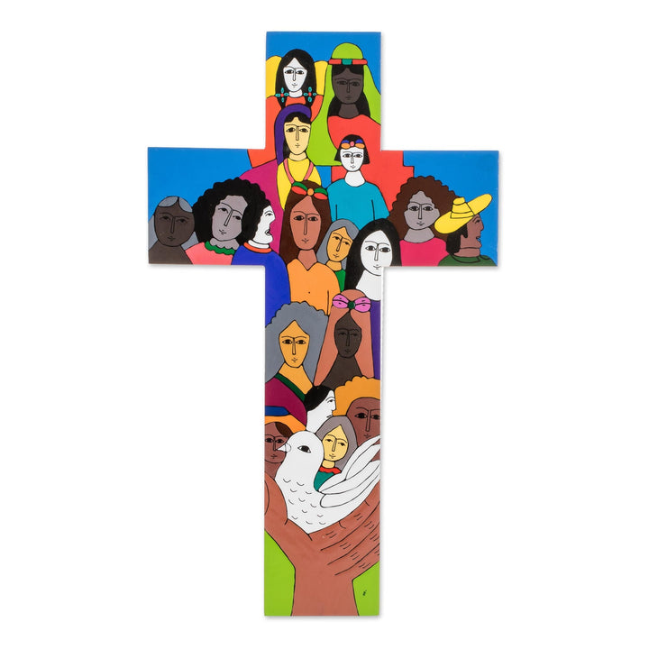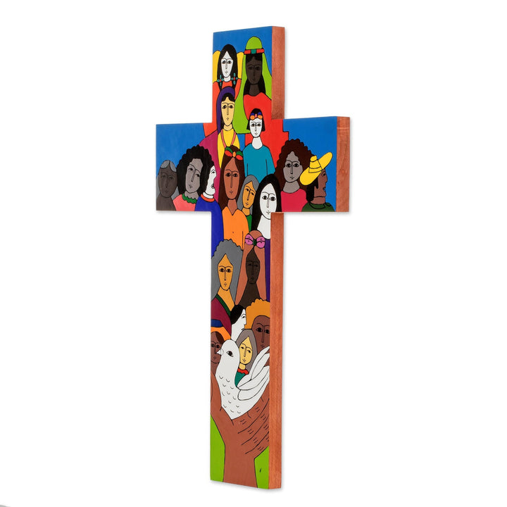 A dove, a symbol of peace, alights on this colorful hand painted cross. People of all nationalities and races crowd the composition in a manifestation of fraternal love. By Woodworkers of Jesus, this cross is a model for peace on earth, carefully crafted of pinewood.