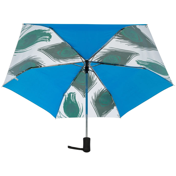 Alternating panels of sky blue and peacock feathers keep you covered when the sky lets loose. The classic umbrella construction features an automatic open/close button as well as a rubberized comfort handle.