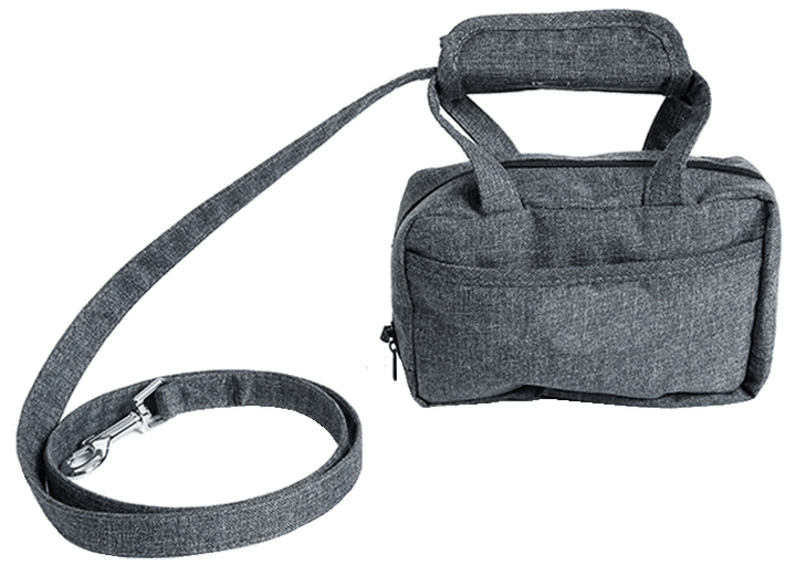 - Features an all-in-one Zippered Purse with a Built-in Leash handle and Waste Bag Dispenser