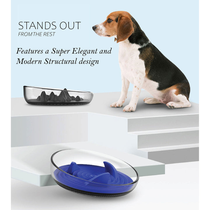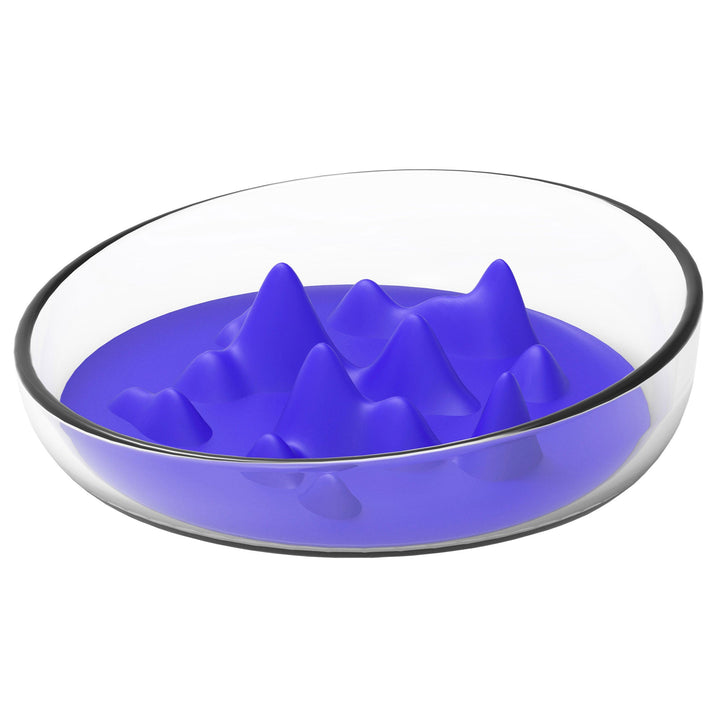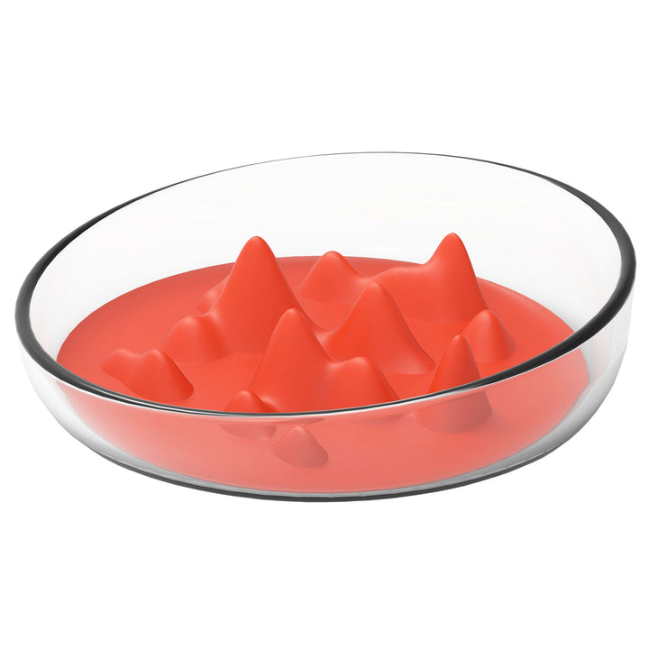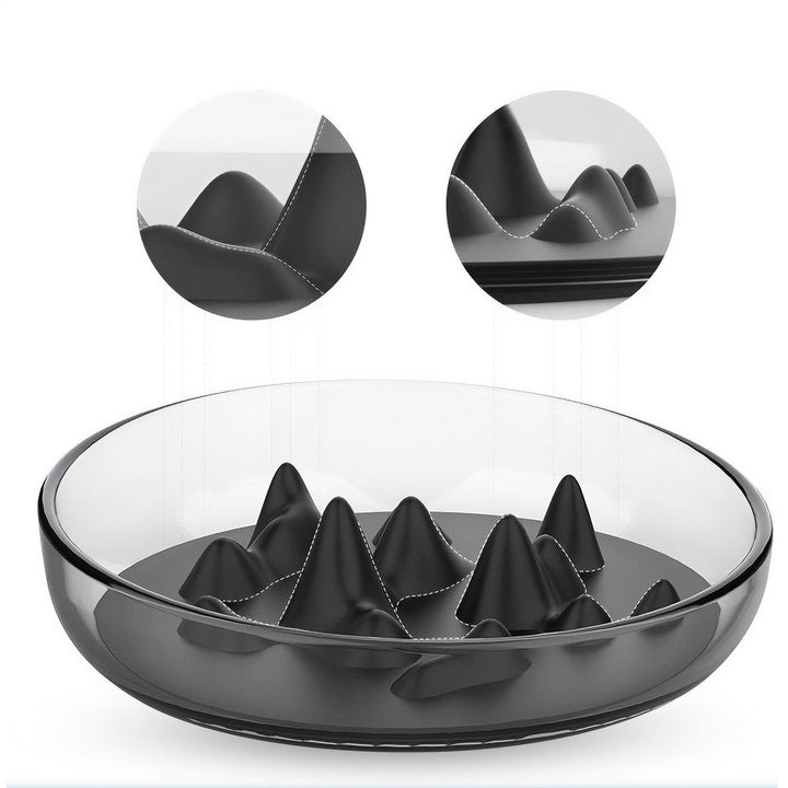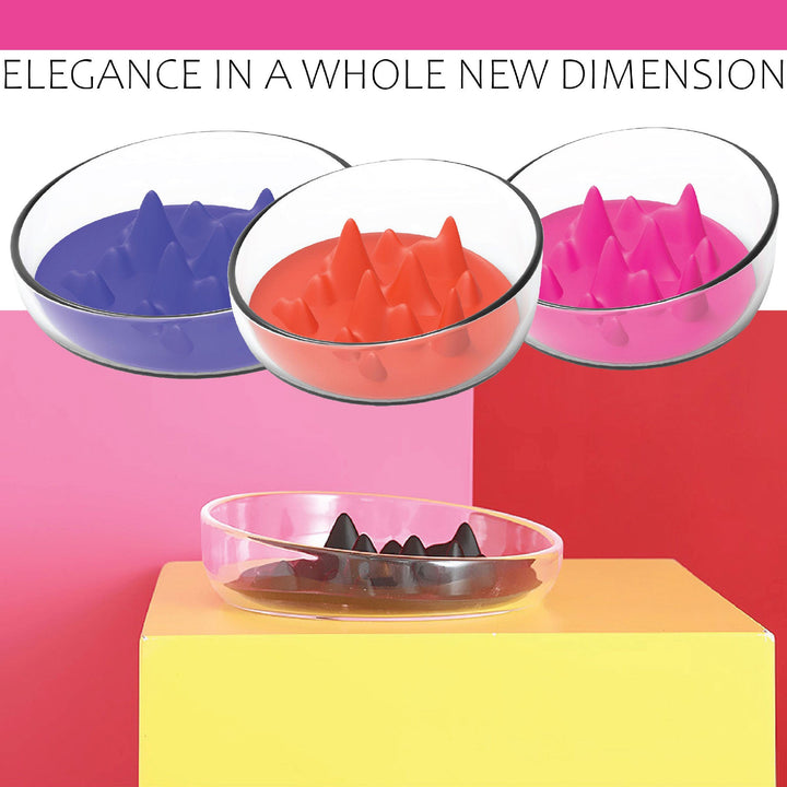 The Pet Life® 'Cirlicue' Mountain Shaped Modern Slow Feeding Pet Bowl is composed of High-Grade Thick and Durable clear transparent plastic material that is harder to break, easy to wash and dishwasher safe. The bottom interior of the bowl features a removable and insertable unique Rubber-like bendable Silicone and TPR Material with mountain top shapes and ridges that creates a slow feeding experience that helps ease or slow digestion.