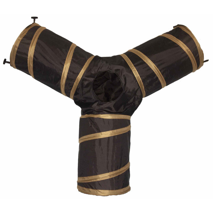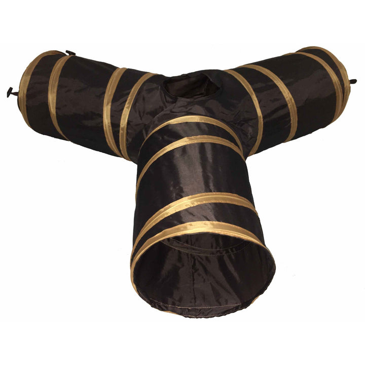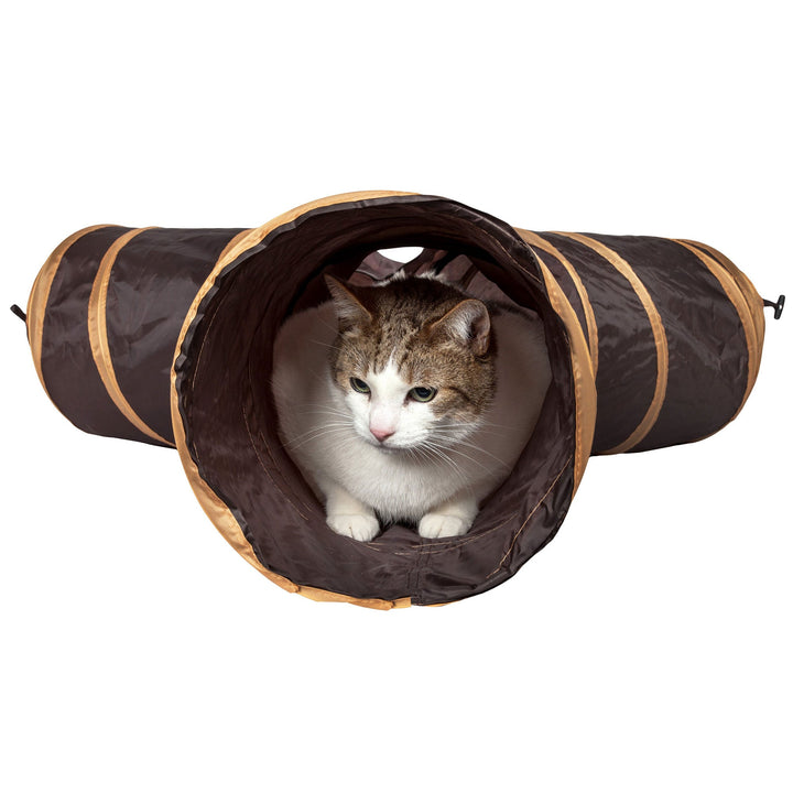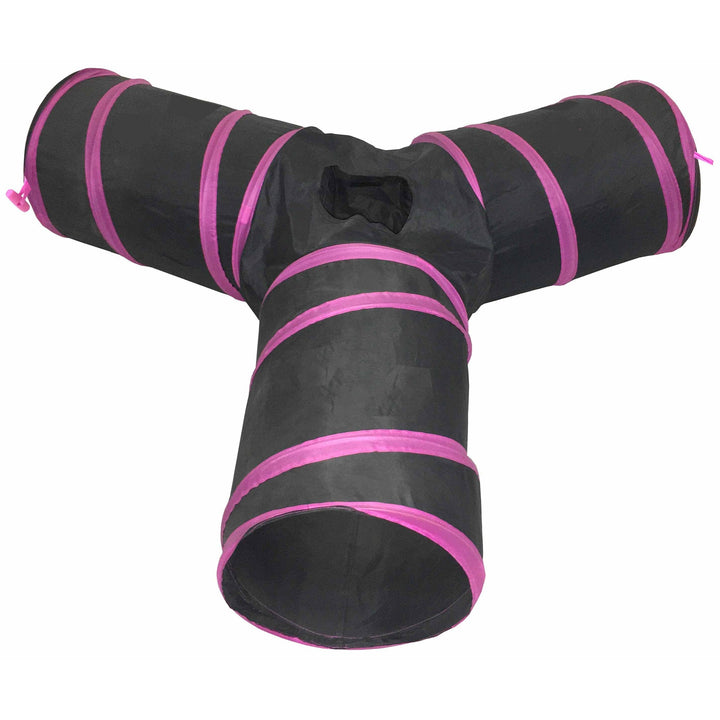 The Pet Life® 3-Way Kitting-Go-Seek Interactive collapsible passage Kitty Cat Tunnel is composed of crackle tear-proof polyester and a durable lightweight inner wiring frame. Features 3 connecting striped expandable tunnels with a peep hole located at the center. Great for usage with multiple cats. The Cat tunnel completely collapses and folds. perfect for outdoor fun or travel. Perfect for all sized cats.