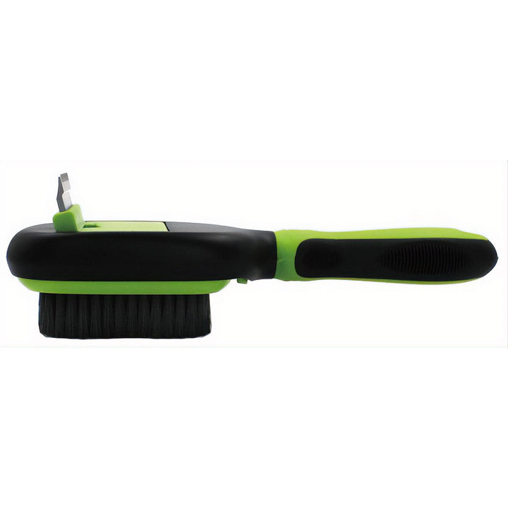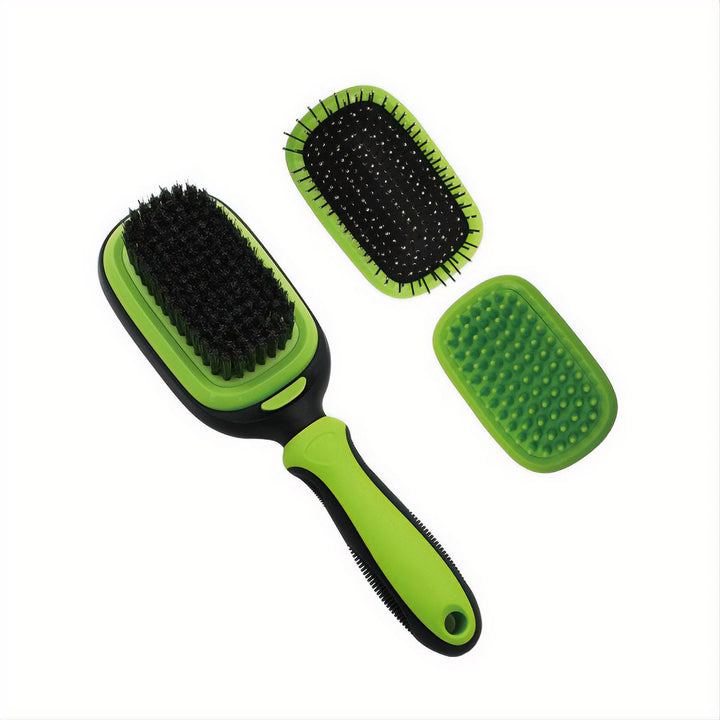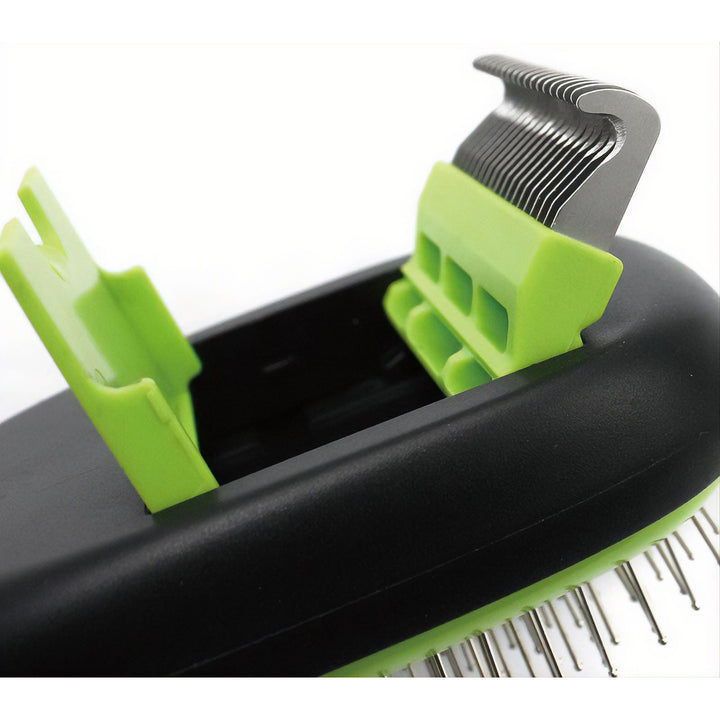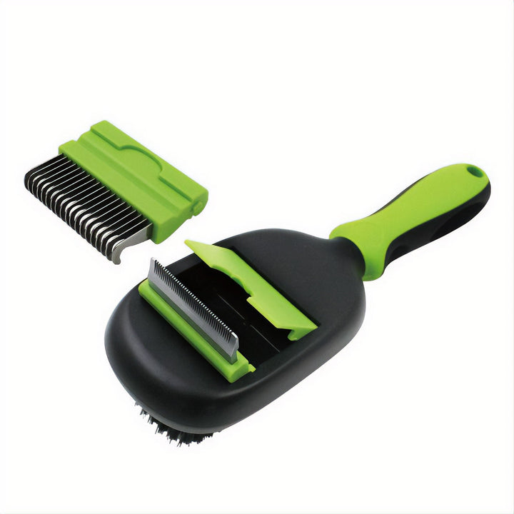 The bristle, pin and silicone massage brushes snap onto the front the device while the de-shedder and de-matter flip opened at the back of the device like a razor. This all-in-one Grooming tool is designed to remove mats and tangles, smoothing their top and inner-coat and massage and lather during bathing.