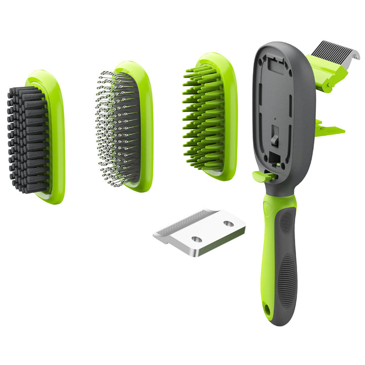 The Pet Life® 'Conversion' 5-in-1 Interchangeable Grooming Tool features an interchangeable stainless steel de-matter, de-shedder, bristle brush, pin brush, and a silicone massage comb making it the perfect all-in-one Grooming Tool you'll ever need.