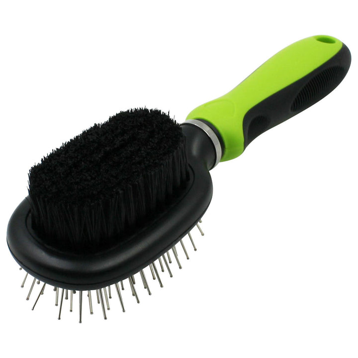 The Pet Life® Flex Series 2-in-1 dual-sided pin and bristle Pet Brush features a uniquely patented Flexible Hinge that is designed to create a smoother brushing experience while placing less stress on the hair. Featuring a cushioned and retractable air-pocket located beneath the Pin Brush for further added comfort.