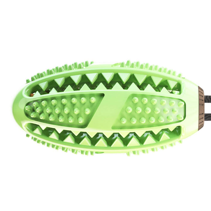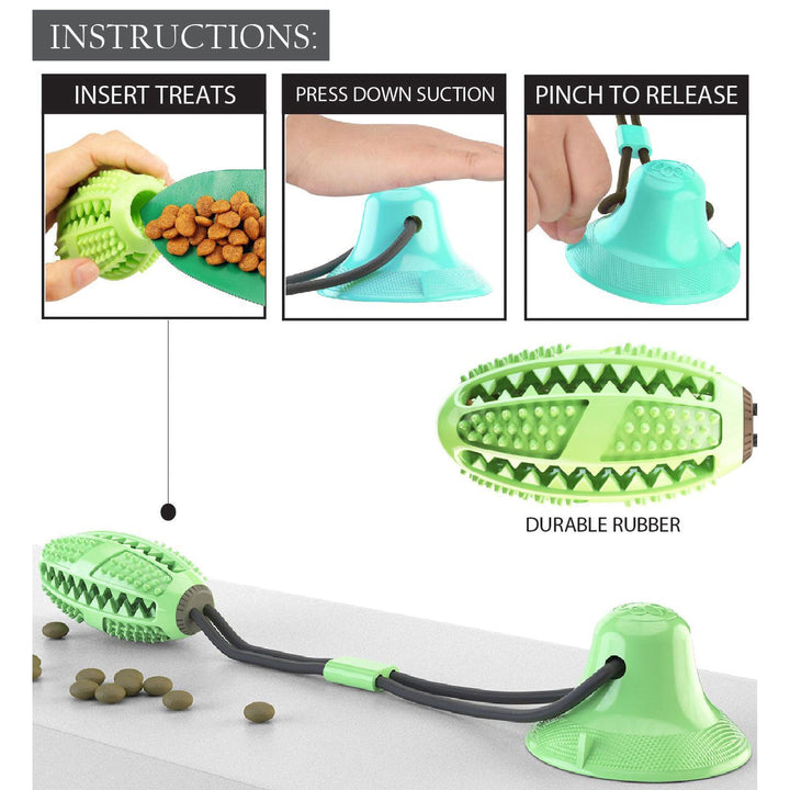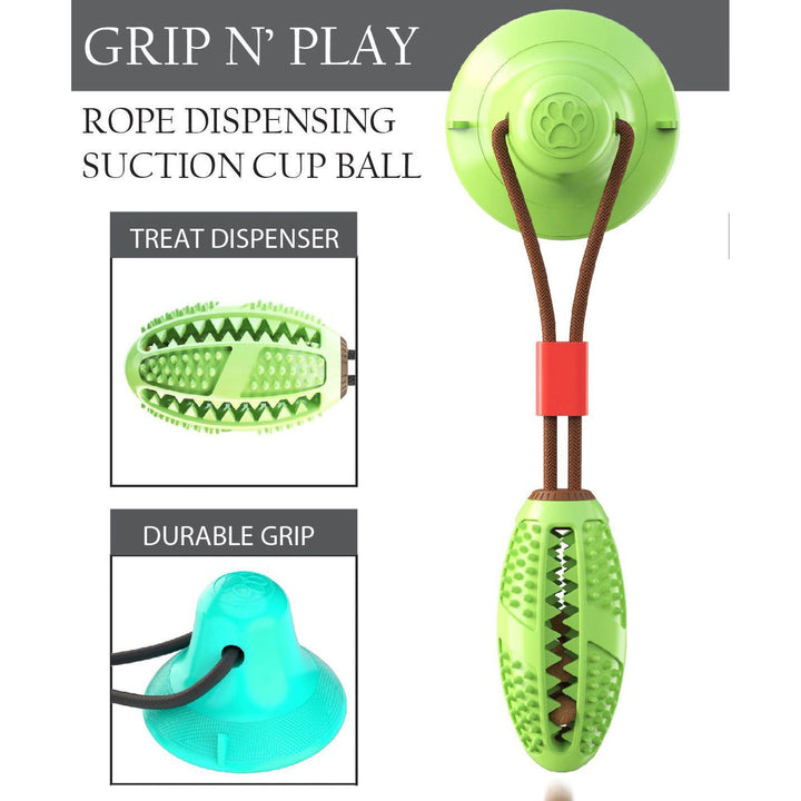 Pet Life®'Grip N' Play' Treat Dispensing Football Shaped Suction Cup Dog Toy is designed to suction and grip to any and all hard surfaces in a matter of seconds. Features Dual-Rope strings that provide high-range tension and pull resistance that is connected to a rubberized football-shaped toy containing numerous crevices for placement of treats or kibble for a fun and engaging interactive experience.
