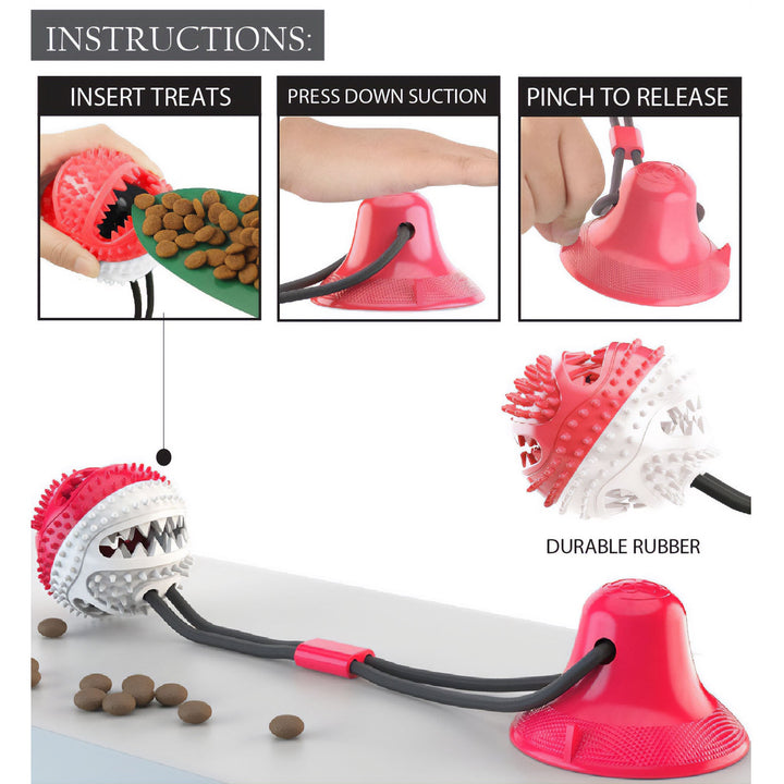 The Pet Life ® 'Grip N' Play' Treat Dispensing Ball Shaped Suction Cup Dog Toy is designed to suction and grip to any and all hard surfaces in a matter of seconds. Features Dual-Rope strings that provide high-range tension and pull-resistance that is connected to a rubberized ball-shaped toy containing numerous crevices for placement of treats and dry dog food for a fun and engaging interactive experience.