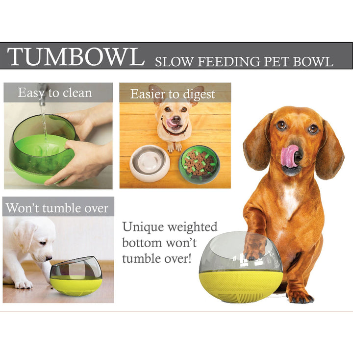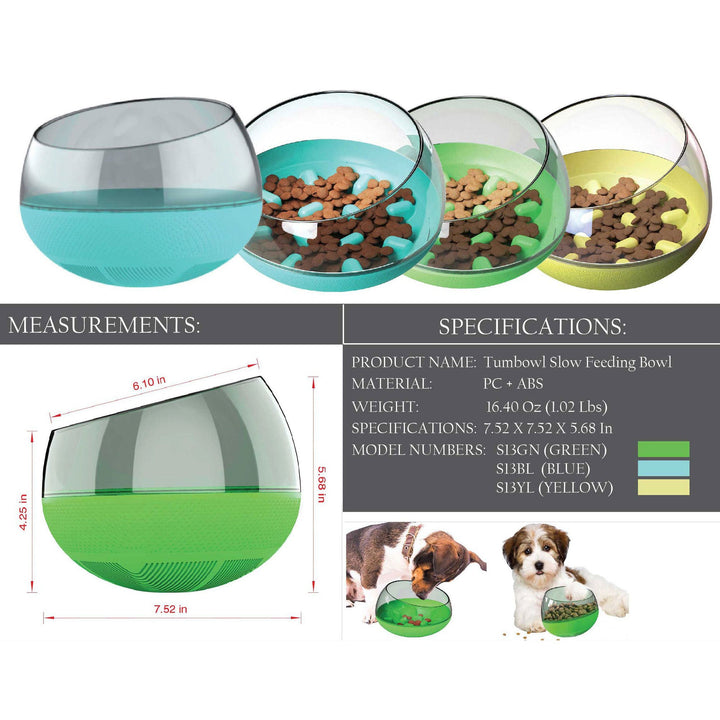 Pet Life® 'Tumbowl' Slow Feeding Pet Bowl features a unique weighted bottom that swivels around and doesn't tilt or tumble over while eating. The bottom of the bowl is a specially designed slow feeder meant to help reduce consumption speed and slow down digestion.