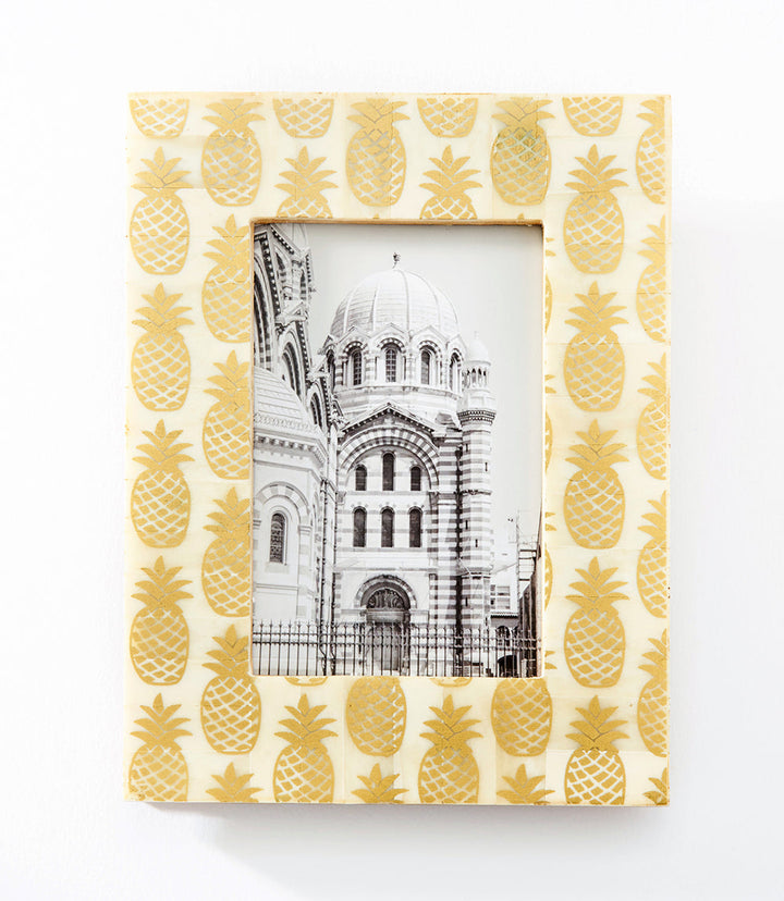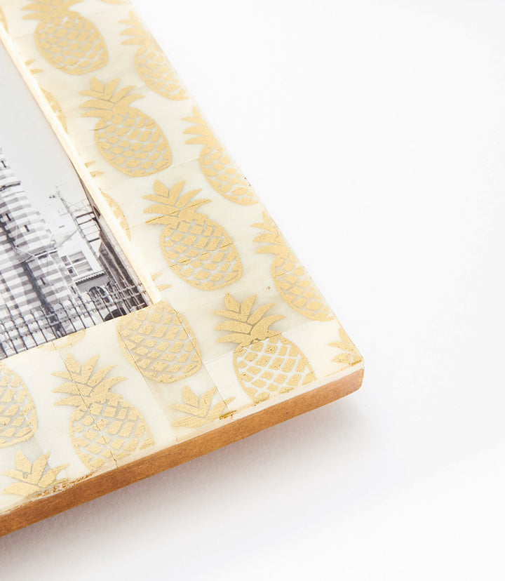 Add some fun decor to your home with this screen-printed pineapple motif frame. Display your most treasured memories in this cruelty-free, ethically sourced bone frame.