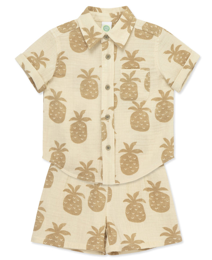 - He'll be sweet from the inside out in this infant boys' 2-piece pineapple short set! This woven cotton set includes a short-sleeve button-down and matching shorts.