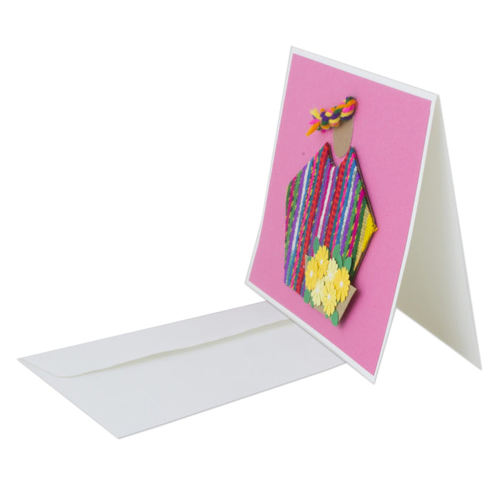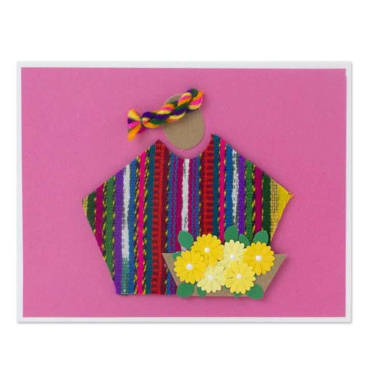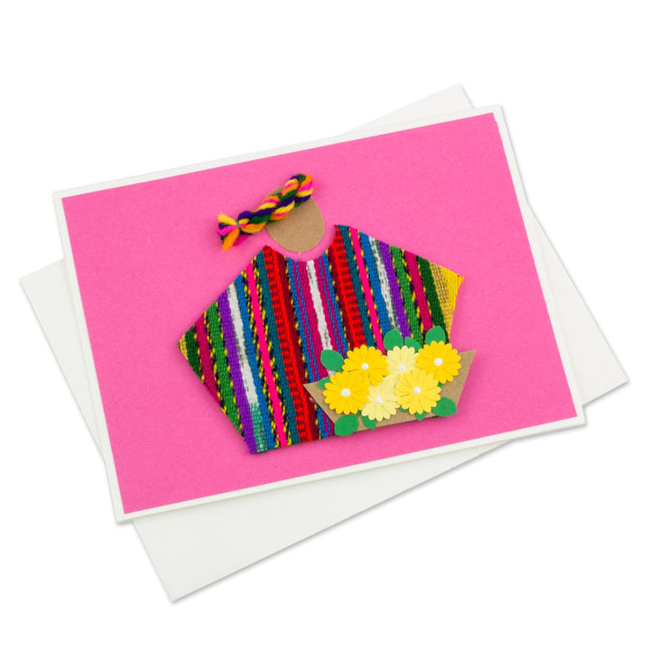 A Maya woman in a colorful handloomed huipil blouse carries a bouquet of daisies. Crafted by hand, these all-occasion greeting cards show the skill of Magdalena Women Artists artisans. Each one features an inset of Guatemala's renowned Maya weavings. They present the blank cards and envelopes in a set of four, tied with a reed cord.