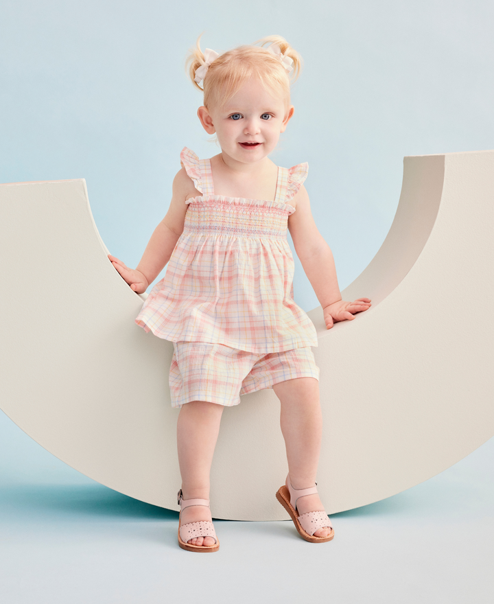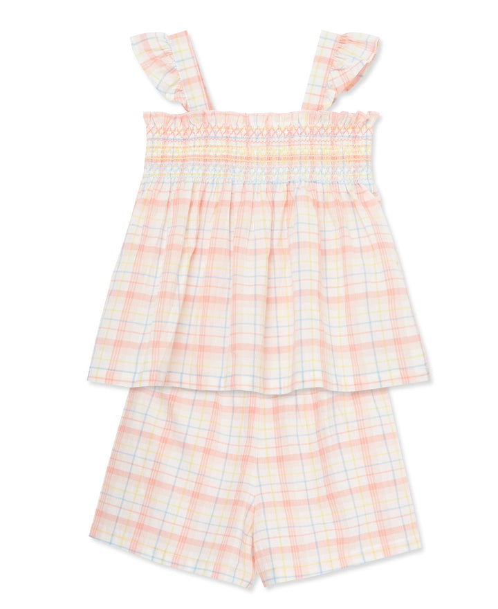 - This girls' woven cotton 2-piece play set is perfectly plaid, featuring the orange and white plaid tunic and matching shorts!
