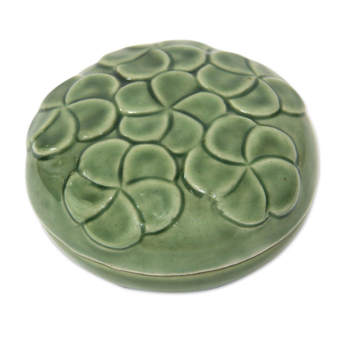 This petite box by Putu Oka Mahendra is crowned with Balinese plumeria blossoms. She works in high-fired ceramic to exalt the island's fragrant flora. The design is perfect to hold rings, earrings or small personal treasures.