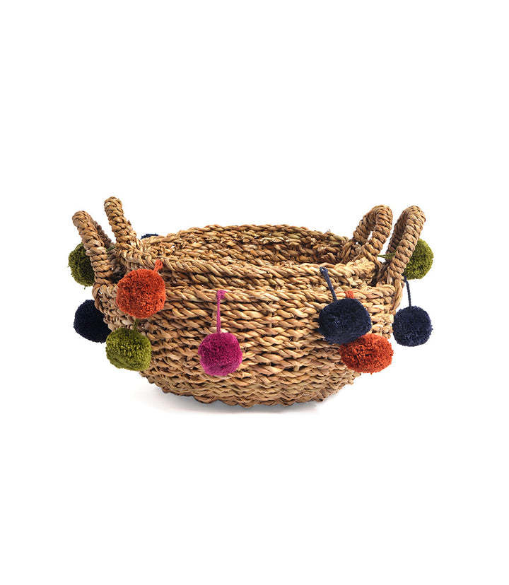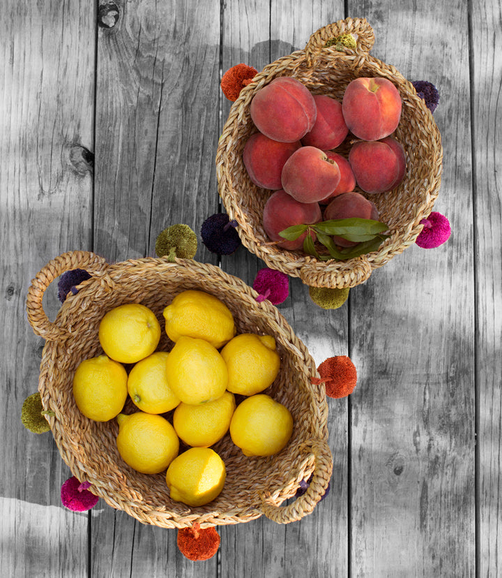 Handwoven holga nesting baskets feature the art of traditional Indian basket weaving in an attractive, modern design with a playful pom pom accent. Master artisans in Bangladesh harvest holga plants and dry the leaves into strips which are skillfully hand braided and woven into beautiful, durable pieces.