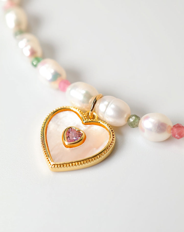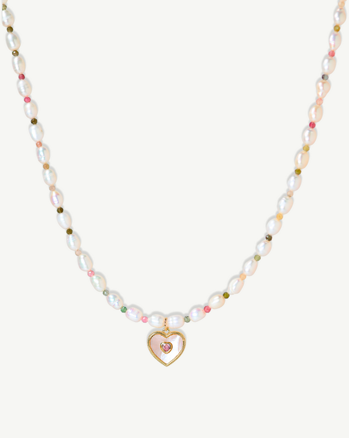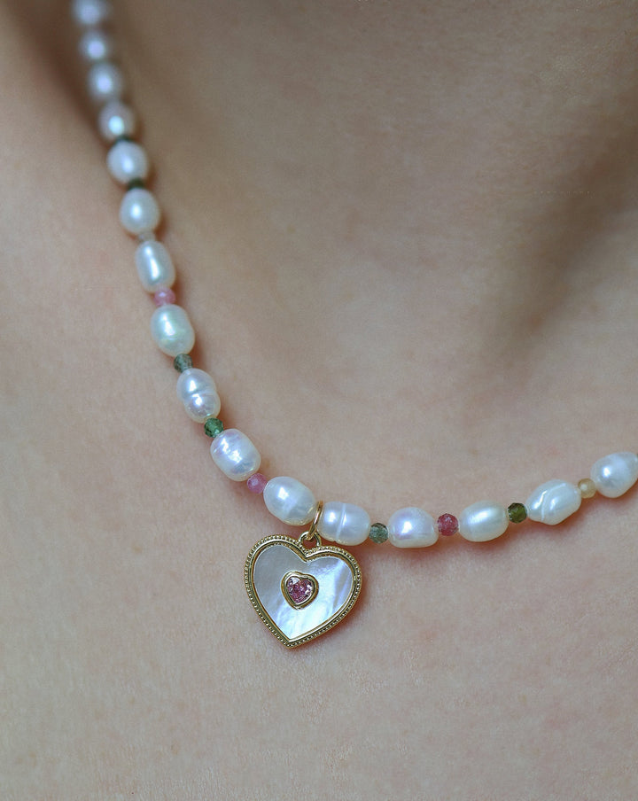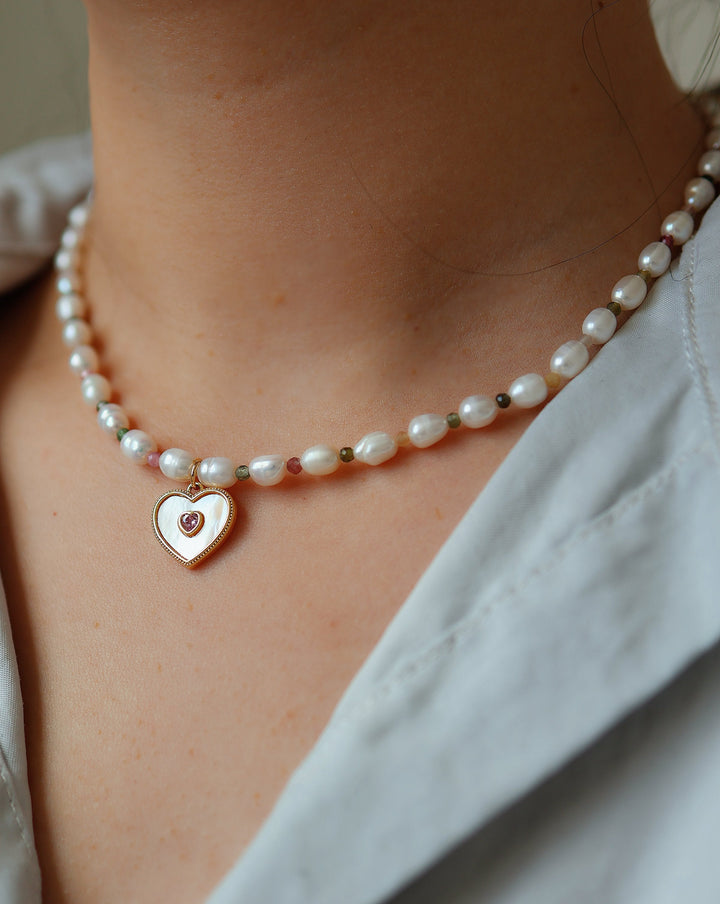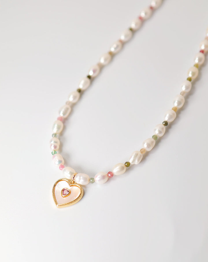 A statement piece that speaks volumes. Crafted with unique natural-shaped freshwater pearls and accented with multicolor tourmaline gemstone beads, this necklace exudes elegance and charm. At its center, a captivating mother-of-pearl heart pendant steals the show, adding a touch of romance to any ensemble. Let your inner princess shine with this exquisite necklace.