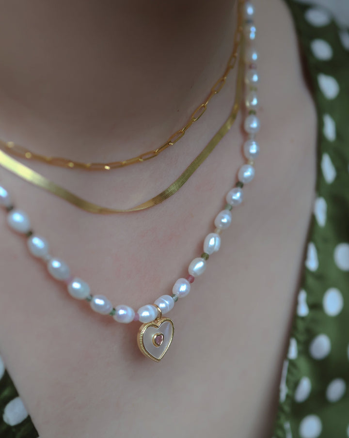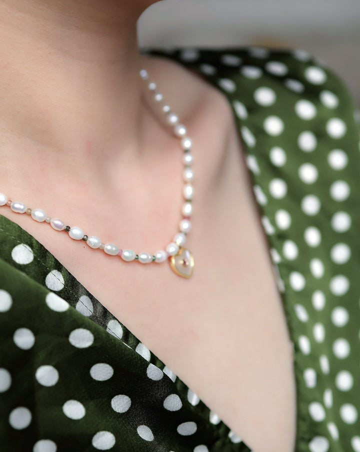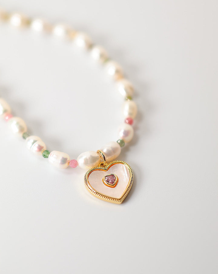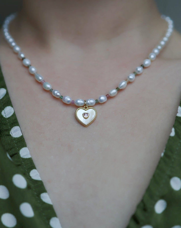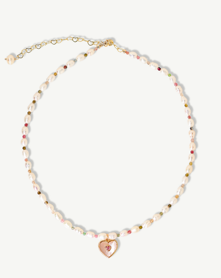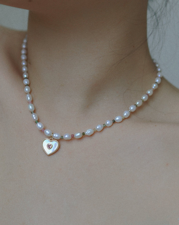A statement piece that speaks volumes. Crafted with unique natural-shaped freshwater pearls and accented with multicolor tourmaline gemstone beads, this necklace exudes elegance and charm. At its center, a captivating mother-of-pearl heart pendant steals the show, adding a touch of romance to any ensemble. Let your inner princess shine with this exquisite necklace.