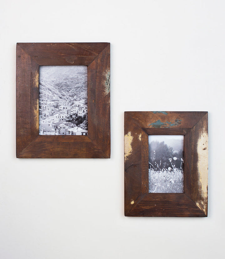 Display your favorite photo with this cute handmade frame. Our Puri Beach House Frames are expertly crafted from reclaimed wood of various type and textured with rustic yellow and teal patina. These frames are an ideal eco chic home accent.