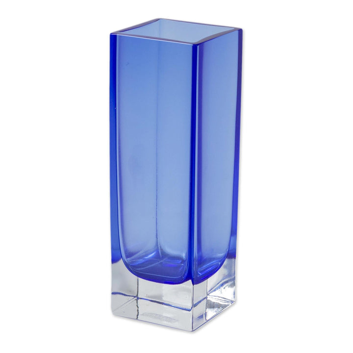 Tall and stately, a radiant square rises from a crystalline base. The design is contemporary yet classic, showcasing the deep sapphire of the art glass. The Seguso Family uses techniques learned by Mario in his family birthplace to craft an exquisite vase.