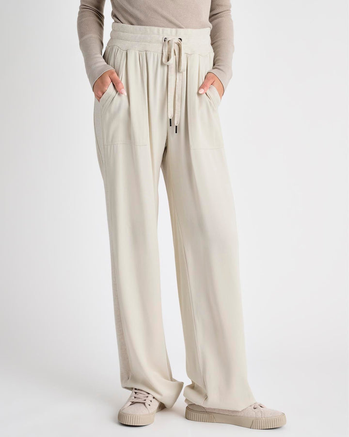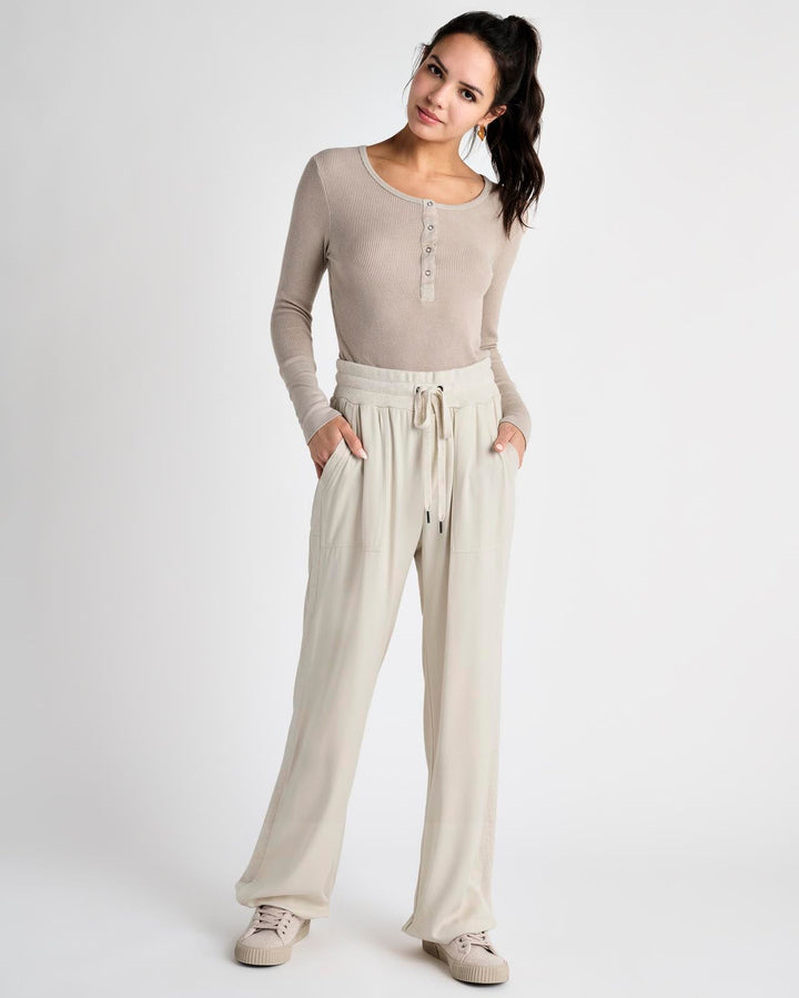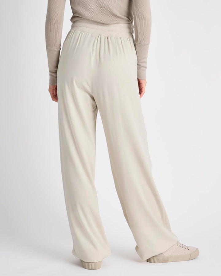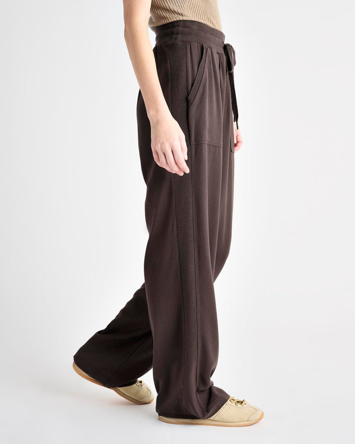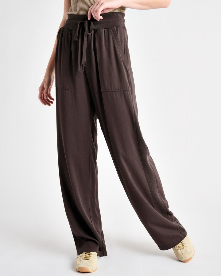 Indulge in everyday ease with our Rafe Wide Leg Pant. This high waisted pair has a drawstring waist and ribbed detailing at the waistband, pockets and side trim. Plus, there are pockets on the front and back for added comfort.